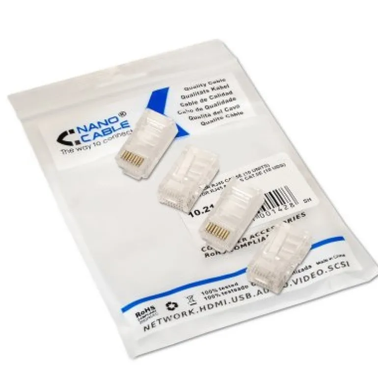 | Características | – Conector: RJ45 – Categoría: 5 – Nº Unidades: 100 – Color: Transparente |