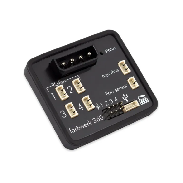 El «farbwerk 360» es un potente controlador de efectos RGB para hasta 360 LED direccionables, compatible con la línea de productos Aqua Computer RGBpx.