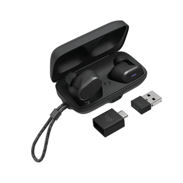 - Duración de batería de auriculares (tiempo en escucha): Hasta 6 h (ANC activada), hasta 10 h (ANC desactivada) 4La duración de la batería se ha medido a partir de una carga completa hasta el apagado automático, utilizando un nivel de volumen del 50 %, tanto para tiempo de conversación como de escucha con detección interna desactivada. Desactive ANC en Logi Tune si es necesario.