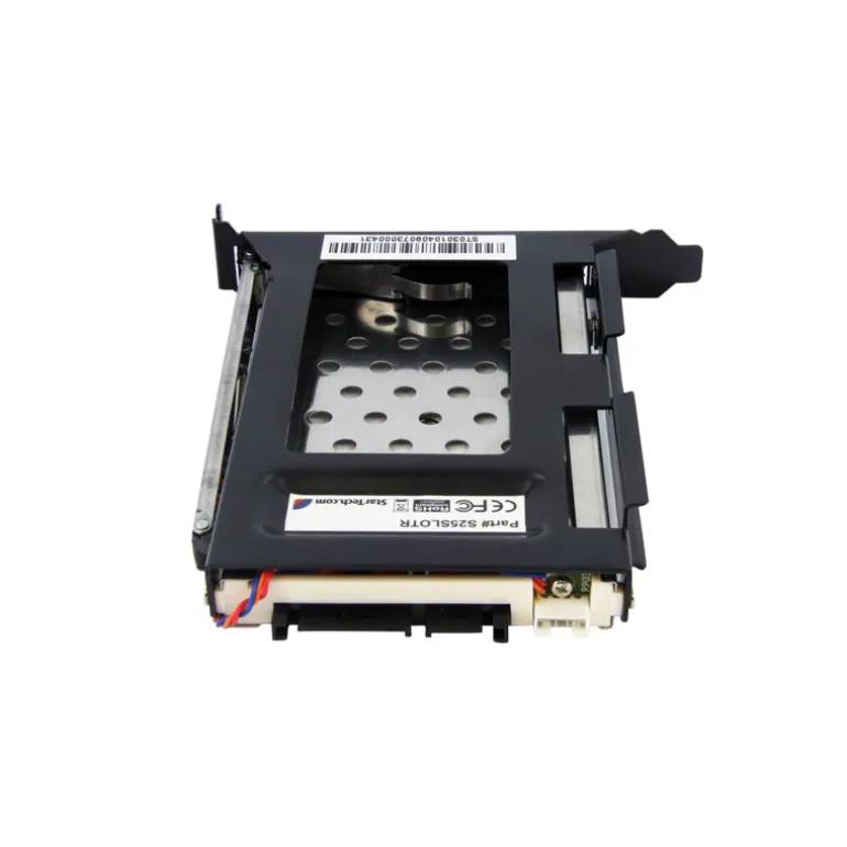 El estante para unidades de disco duro sin bandeja, modelo S25SLOTR, se puede instalar en una ranura de tarjeta de expansión PCI (perfil completo) disponible, lo cual permite el fácil acceso a una unidad de disco duro SATA o SSD de 2,5″ desde el panel trasero de una caja de ordenador.