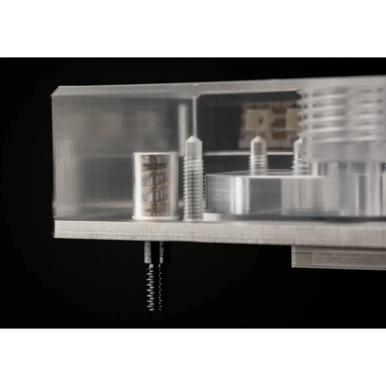 La placa fría está fabricada con cobre electrolítico de la más alta calidad, con un mecanizado preciso para lograr el mejor contacto posible y una transferencia de calor óptima, y además está niquelada. Esta versión del bloque de agua cuenta con una placa fría niquelada y una parte superior de acrílico fundido mecanizado por CNC.