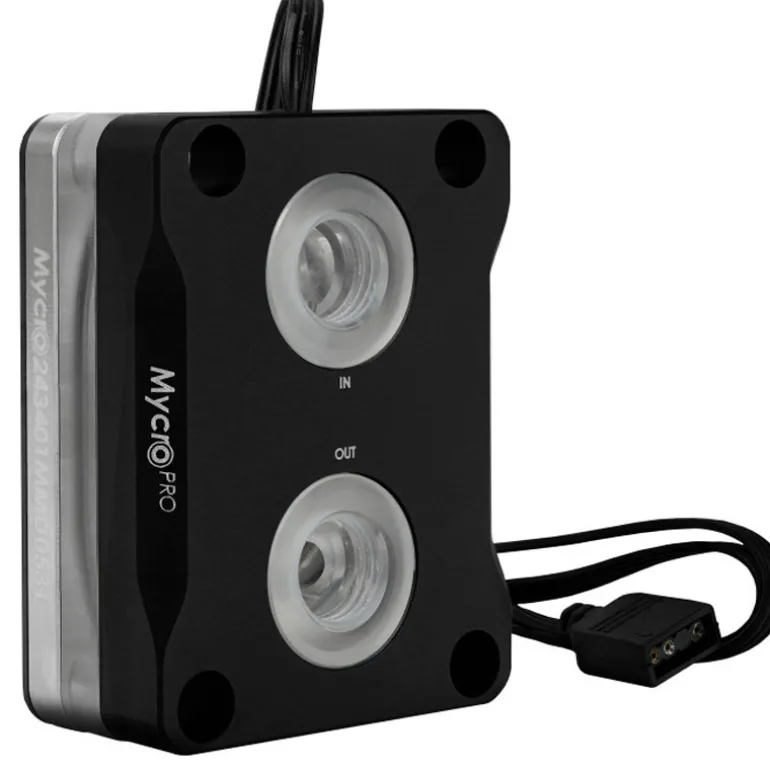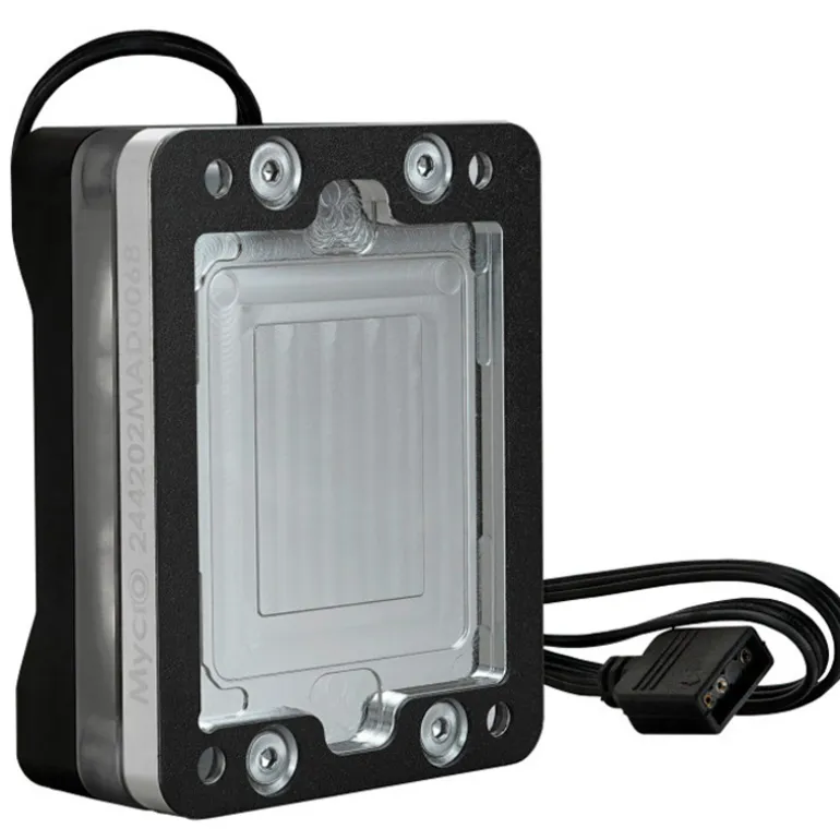 El Intel 1851 Mycro Direct-Die Pro RGB V1 es un bloque de refrigeración líquida optimizado para la plataforma Intel LGA1851, con una base de cobre niquelado y con iluminación RGB. La placa fría cuenta con micro aletas de refrigeración con baja resistencia al flujo. El bloque se coloca directamente sobre el chip de la CPU de Intel delidded, lo que garantiza que el calor del procesador tome el camino más corto posible hacia el circuito de agua. Una lista actualizada de todos los procesadores compatibles verificados está disponible en línea.
