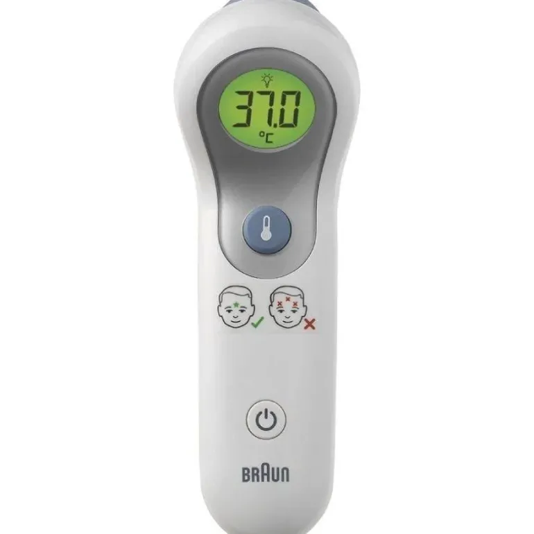Termómetro de frente con funciones con y sin contacto. Diseñado pensando en la comodidad, le permite tomar una medición en solo un par de segundos orientándolo en el centro de la frente, entre las cejas.