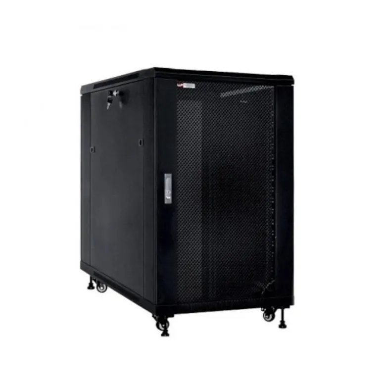 La capacidad de carga de hasta 800 kg permite alojar equipos pesados con facilidad, mientras que las patas de nivelación y las ruedas (incluyendo frenos en dos de ellas) facilitan la movilidad y estabilidad del armario. Además, la carcasa está diseñada para albergar ventiladores de 120 mm o kits de ventilación especializados en la parte superior, mejorando la gestión térmica y asegurando un funcionamiento óptimo del equipo.