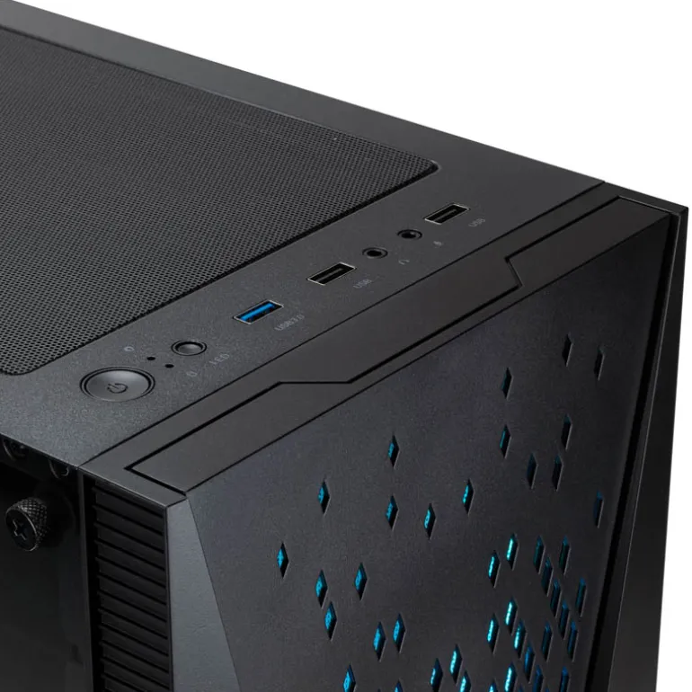 El panel superior está equipado con un puerto USB 3.0 y dos puertos USB 2.0, lo que le permite conectar fácilmente varios dispositivos o periféricos y cargar accesorios. Además, dispone de conector de auriculares y micrófono.