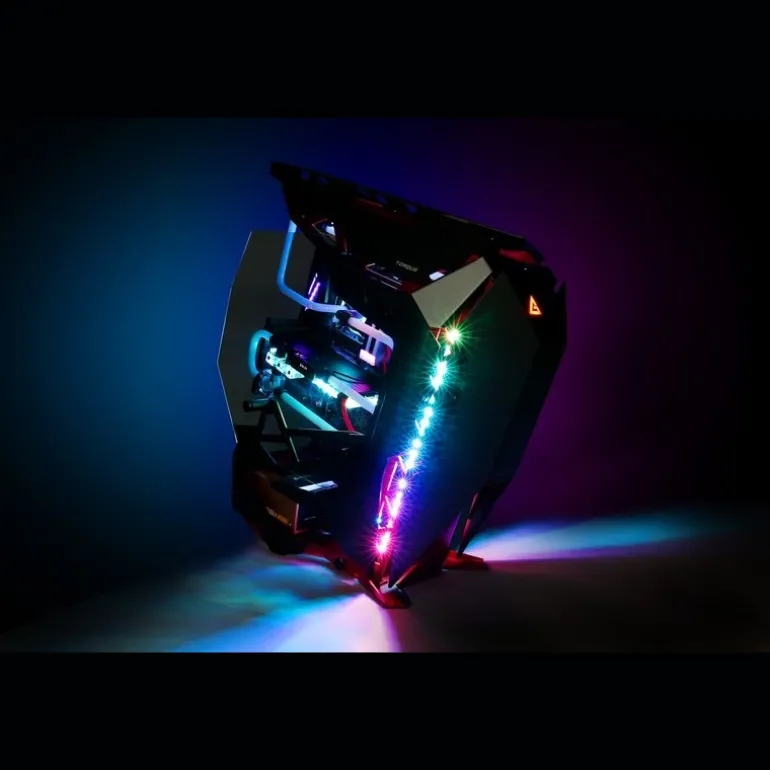 La caja Open Frame permite increíbles opciones de rango de construcción incluyendo la instalación de una amplia gama de componentes de refrigeración por agua, como radiadores duales de 360 mm, numerosas bombas y más, mientras que el exclusivo diseño inclinado proporciona una orientación de 45 grados en la placa base para una apariencia futurista .