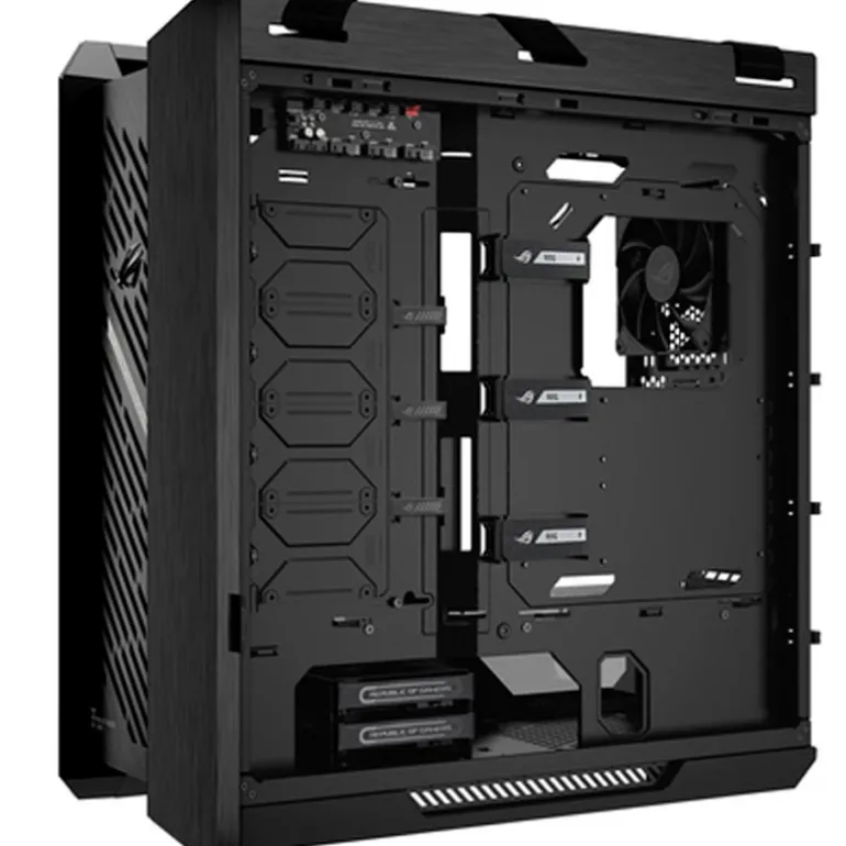 El ROG Strix Helios II está pensado para montajes de vitrina, con dos paneles laterales de cristal templado de 4 mm de grosor encajados en un refinado marco de aluminio cepillado. El panel frontal de aluminio, con un diseño de rejilla en forma de diamante, se fabrica con tecnología de fresado CNC de alta precisión y un proceso de anodizado. Las barras diagonales de la parte delantera se inspiran en la elegancia y la individualidad de los coches de carreras para hacer que el Helios II sea único. Con bordes redondeados, una forma aerodinámica y costuras ocultas, este chasis es más elegante que nunca.