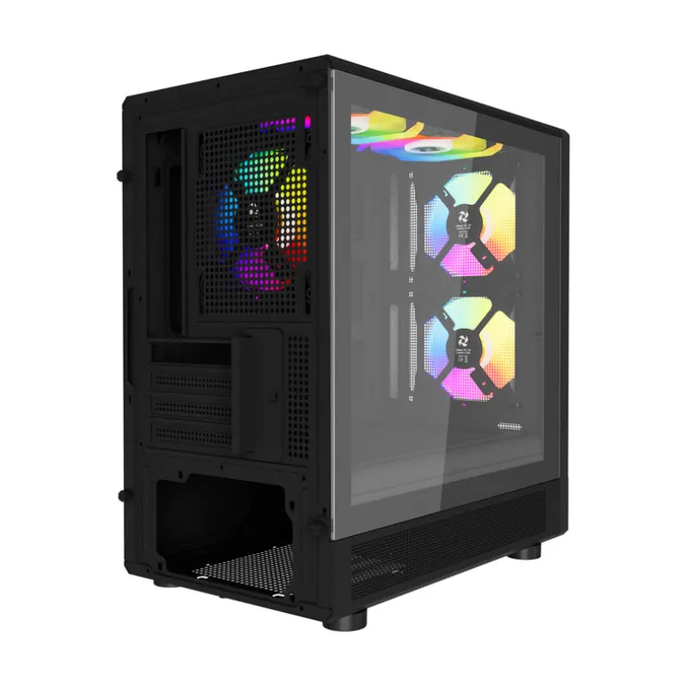 El diseño incluye un panel lateral izquierdo de vidrio templado deslizable, permitiendo una vista clara de los componentes internos, y un panel lateral derecho de metal que ofrece una protección adicional. La torre está equipada con tres ventiladores M11 ARGB preinstalados, los cuales aportan un toque visual atractivo a tu configuración. El control de las luces LED se realiza fácilmente a través del botón de reinicio o mediante la placa base, proporcionando opciones de personalización según tus preferencias.