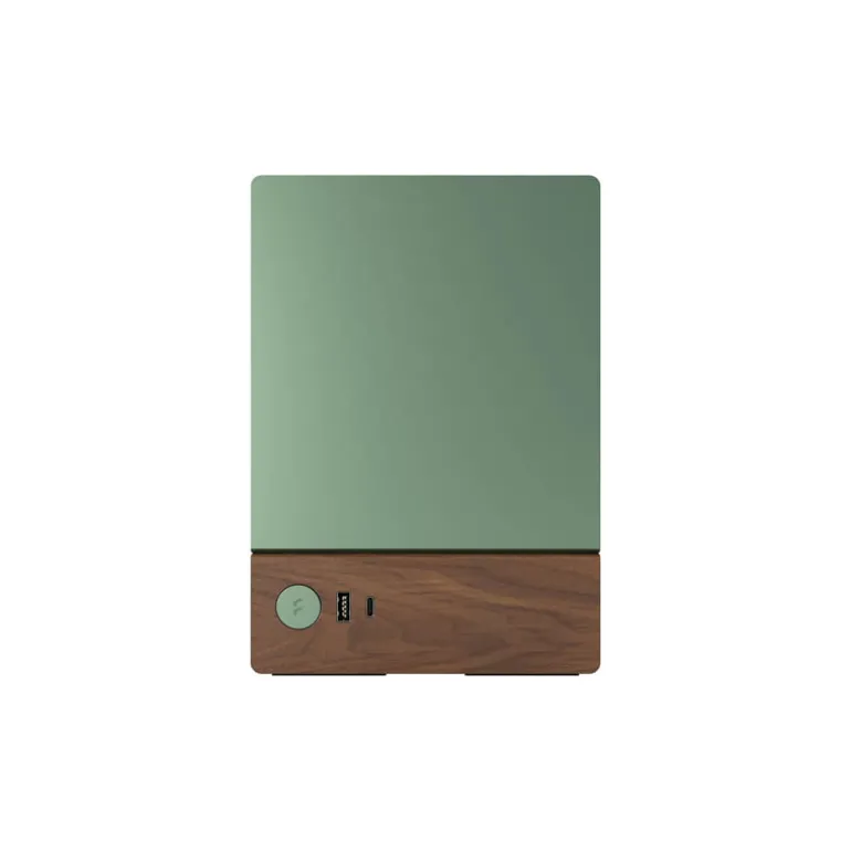El panel frontal de nogal macizo cuenta con un botón de encendido de aluminio y dos puertos USB para conectar dispositivos, incluido un USB tipo C de 20 Gbps.