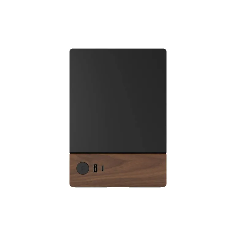 El panel frontal de nogal macizo cuenta con un botón de encendido de aluminio y dos puertos USB para conectar dispositivos, incluido un USB tipo C de 20 Gbps.