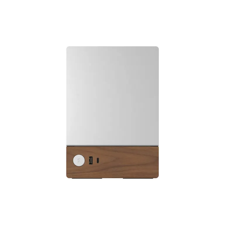 El panel frontal de nogal macizo cuenta con un botón de encendido de aluminio y dos puertos USB para conectar dispositivos, incluido un USB tipo C de 20 Gbps.