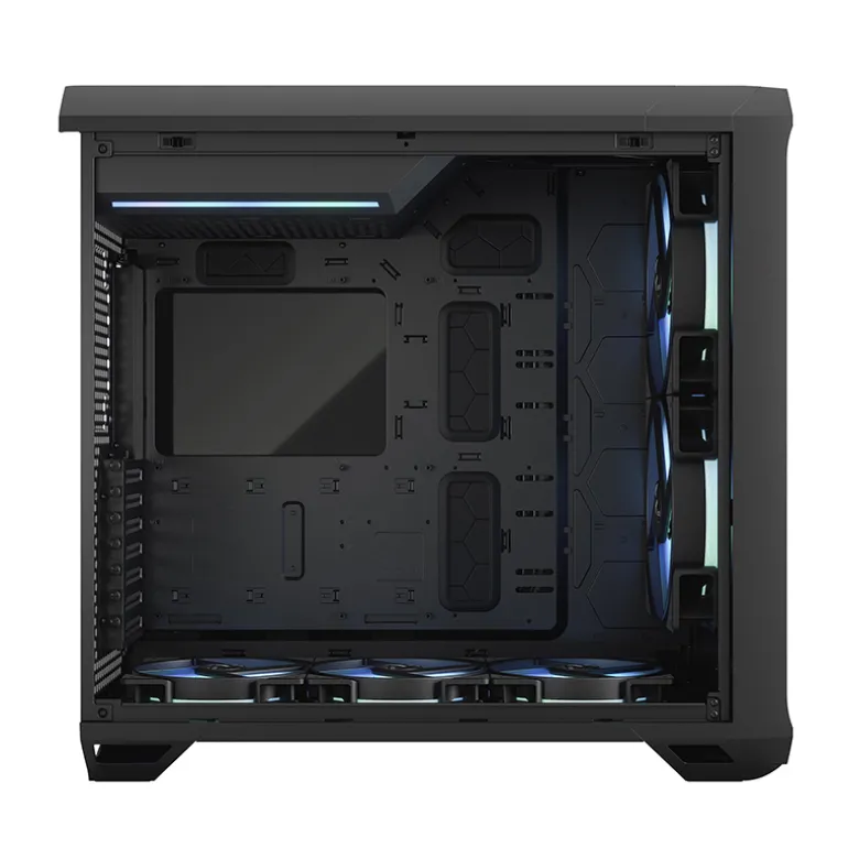 El interior se ha optimizado completamente para un flujo de aire sin obstrucciones. La fuente de alimentación se encuentra en la parte superior de la carcasa, en un conducto de fuente de alimentación aerodinámico. Los guiados y soportes cuidadosamente diseñados facilitan una gestión de cables ordenada, lo que beneficia tanto a la estética como al flujo de aire dirigido. Los dispositivos de almacenamiento, como SSD y HDD, se montan en la parte trasera de la bandeja de la placa base, contribuyendo también a un interior ordenado.