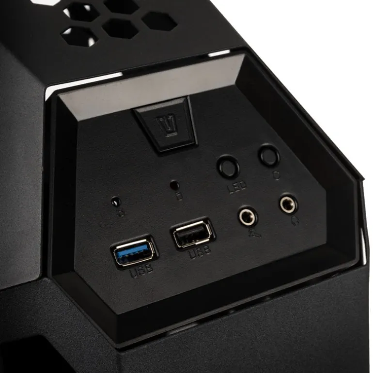 El panel de E/S está en la parte delantera del borde superior. Ofrece amplias conexiones para sus periféricos: un puerto USB 2.0, un puerto USB 3.0 y conectores de audio HD para micrófonos y auriculares. Además, hay un botón de control LED para un acceso rápido y fácil a la iluminación.