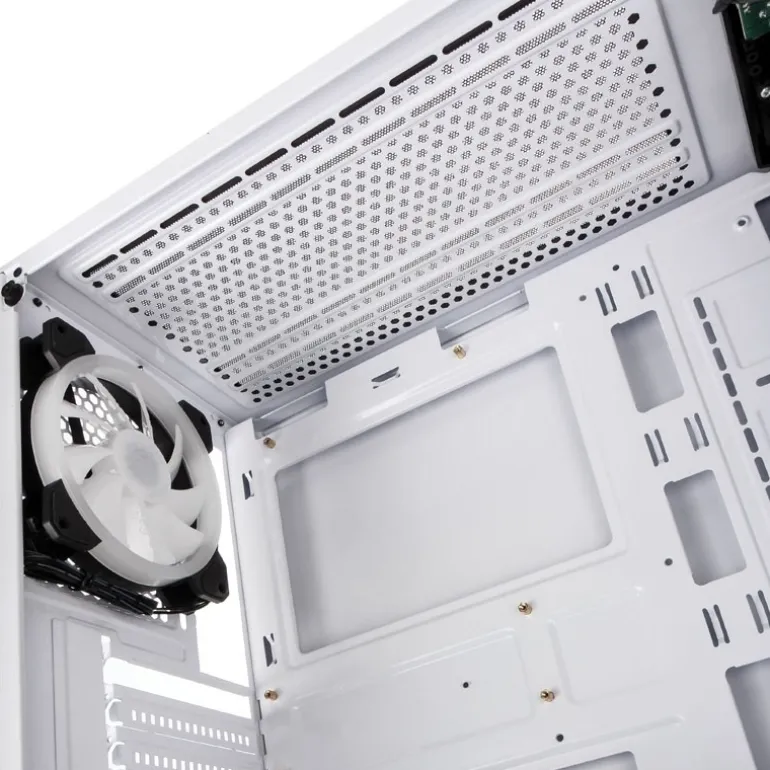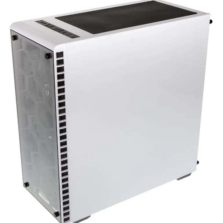 El robusto chasis consiste en un acero SECC fuerte de un milímetro y está equipado con un panel lateral y de vidrio templado de cuatro milímetros de grosor . El interior interior tiene un revestimiento negro y también está equipado con una cubierta para la fuente de alimentación para garantizar un aspecto increíblemente limpio. También hay una caja de disco duro con soportes para dos unidades de 3,5 o 2,5 «.
