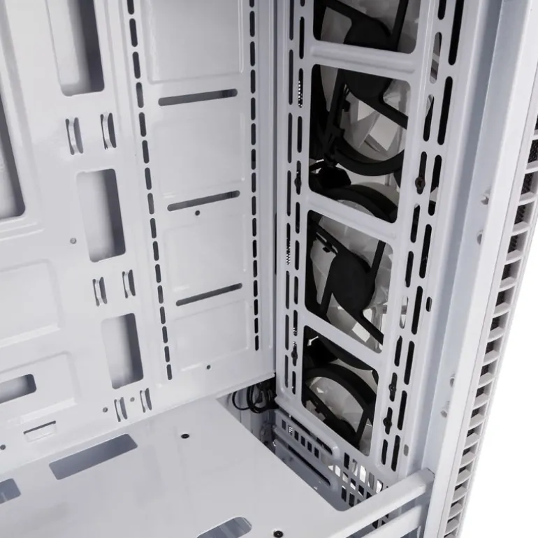 La bandeja de la placa base y la cubierta de la fuente de alimentación ofrecen numerosas aberturas para cables. Se puede instalar un radiador de 240 mm en la parte frontal y superior del gabinete del Observatorio. Las salidas de aire de la carcasa vienen equipadas con filtros de polvo fino que se encuentran en la parte superior e inferior de la carcasa. Estos se pueden quitar sin la necesidad de herramientas e incluso se pueden completar con un diseño de nido de abeja inteligente.