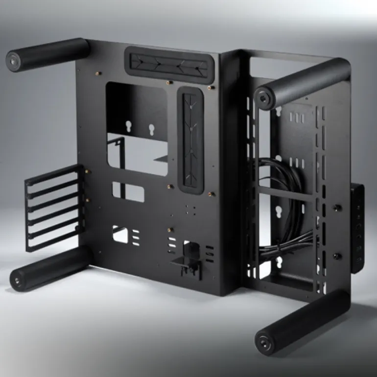 PAEAN M, arte de diseño en su mejor momento por RAIJINTEK – un chasis Micro ATX de marco abierto, la estructura principal incluye placa intermedia, hecha de aluminio de 3,0 mm con chorro de arena negro, cilindro de aluminio 4pcs con tubo de goma y vidrio templado de 4,0 mm en la parte delantera.