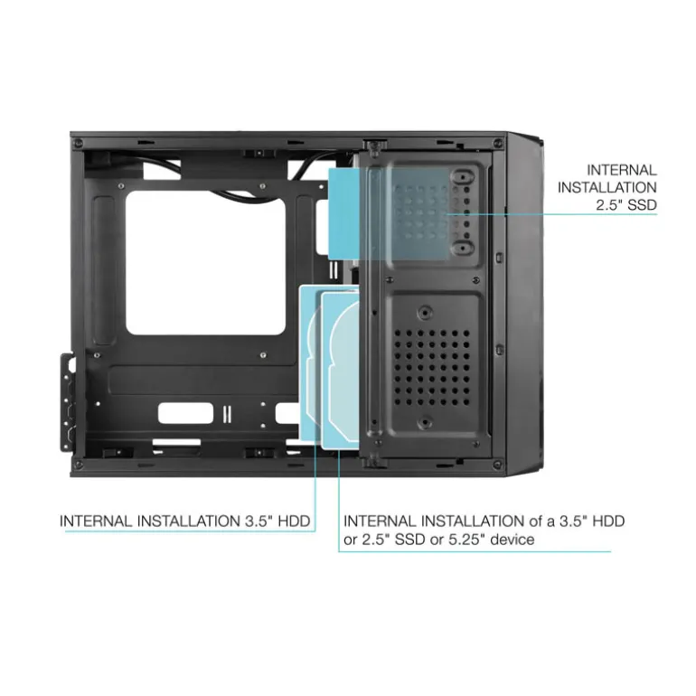 Para mantener un óptimo rendimiento térmico, la torre soporta la instalación de ventiladores, con opciones para un ventilador frontal de 80 mm para mejorar el flujo de aire interno. Esto se complementa con la inclusión de una fuente de alimentación SFX de 500W, que no solo es potente sino también silenciosa, asegurando un funcionamiento eficiente y sin ruidos molestos.
