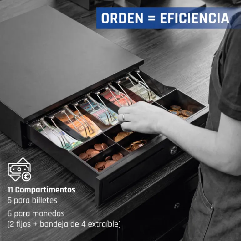 - Compartimentos: 5 billetes y 6 monedas