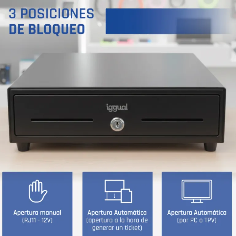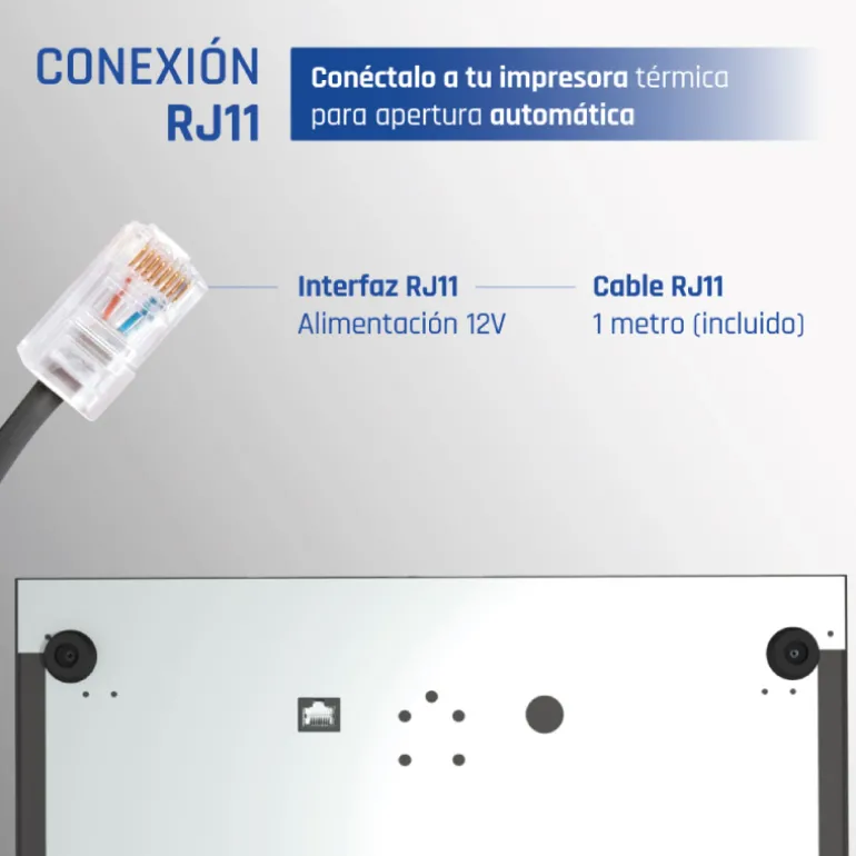 Incluye interfaz RJ11 (alimentación 12V) y cable RJ11 de 1 metro para una integración sencilla con la mayoría de terminales punto de venta. Todo ello en un diseño compacto (330 × 333 × 90 mm) y robusto, con 3,3 kg de peso neto, acabado en color negro.