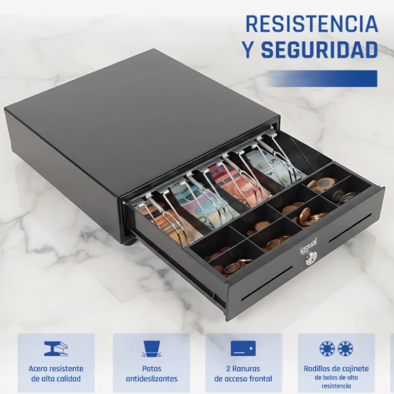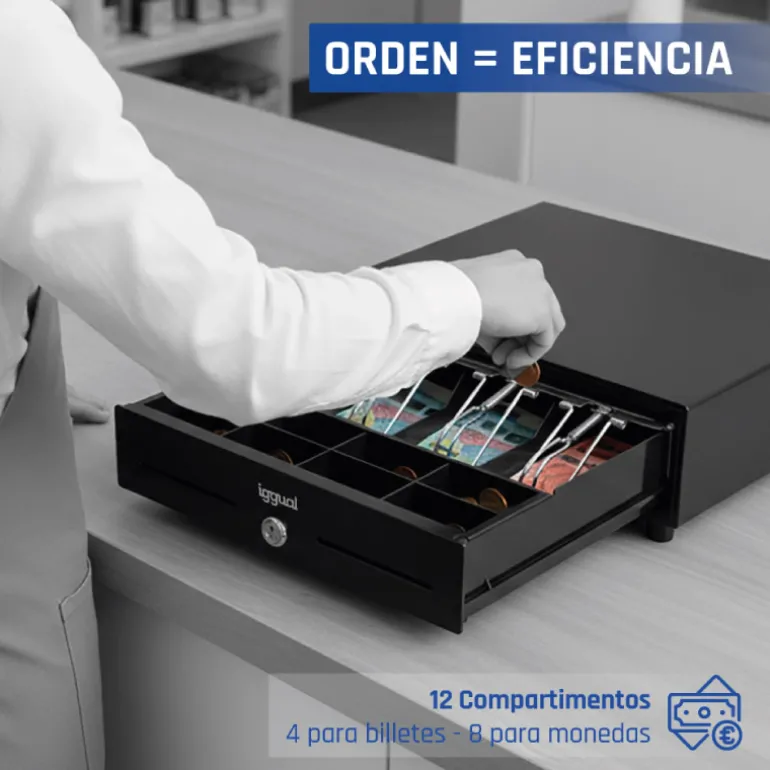 Su interior está optimizado para una gestión rápida y segura del efectivo: 4 compartimentos para billetes, 8 espacios para monedas y una bandeja extraíble con divisores ajustables, perfecta para negocios que requieren una clasificación precisa.