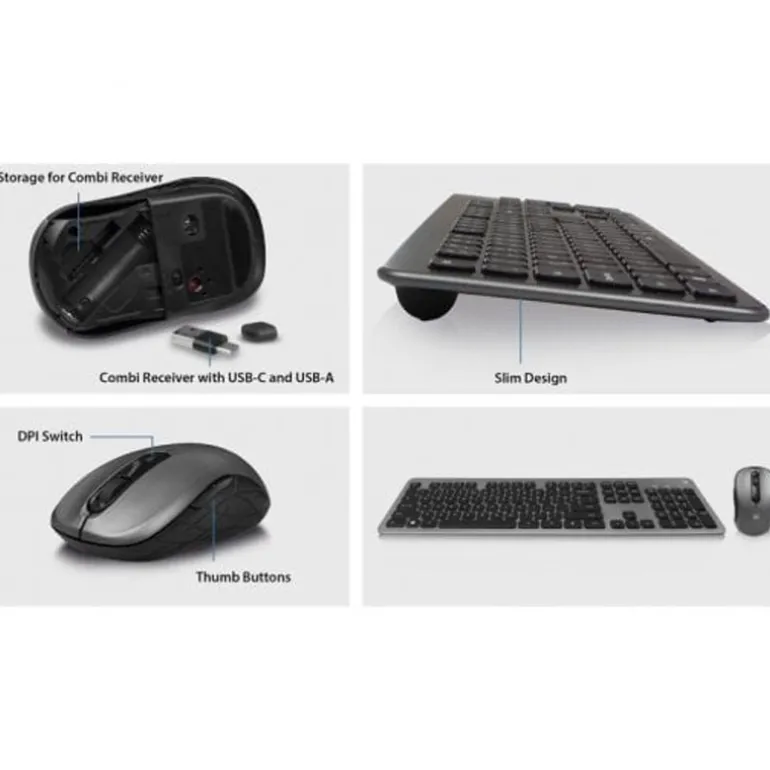 Receptor USB-C y USB-A: Tanto el teclado como el ratón funcionan mediante un único receptor que incluye conexiones USB-C y USB-A, facilitando su compatibilidad con distintos dispositivos y eliminando la necesidad de múltiples receptores.