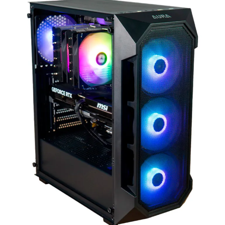 Caja gaming con iluminación ARGB, diseñada para montar un equipo con estética llamativa y ventilación adecuada. Su función es alojar los componentes y gestionar flujo de aire/cableado.