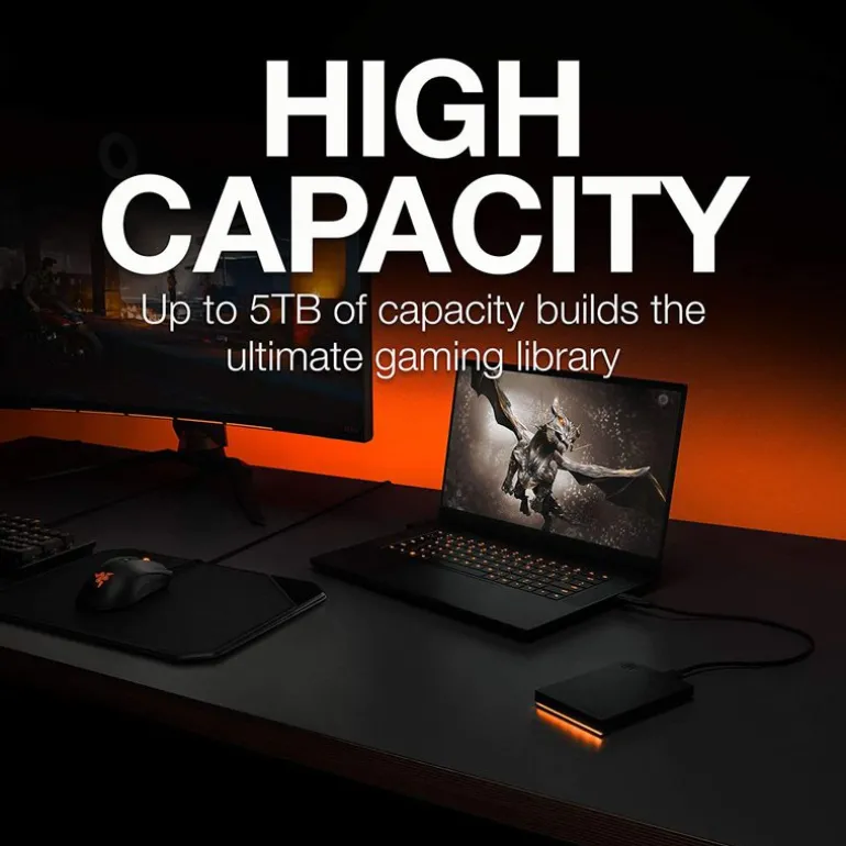 Conecte la unidad de disco duro FireCuda para juegos y disfrute de la iluminación. Esta unidad de disco duro para juegos, creada con una capacidad de hasta 5 TB y un diseño elegante y atrevido, puede albergar todos sus títulos y estar a la altura de su estación completa. Añada un nivel extra de ambiente a las sesiones de juegos con la iluminación LED RGB.
