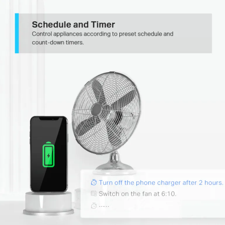 Con la función Programación puedes hacer que el enchufe Wi-Fi Inteligente se encienda o apage a determinadas horas varios días a la semana, solo los lunes o toda la semana, tú decides. Además, con la función Temporizador puedes cear una cuenta atrás para apagar el enchufe, ideal para poner a cargar el móvil y ahorrar energía.