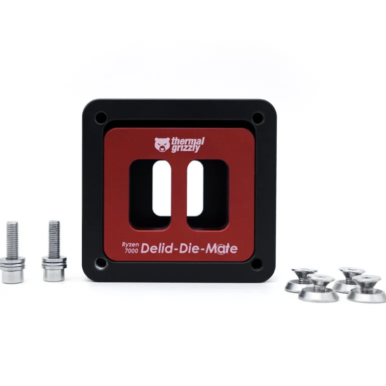 Ryzen 7000 Delid-Die-Mate de Thermal Grizzly es una herramienta para eliminar el disipador de calor («dehead», «delidden») en los procesadores AMD Ryzen 7000. Esto permite que la CPU se enfríe a través de «Direct Die», por ejemplo. El enfriador de la CPU se monta directamente en los troqueles de la CPU y en el troquel de E/S del procesador. Al omitir el disipador de calor en el circuito de enfriamiento, es posible una transferencia de calor significativamente optimizada desde los troqueles al enfriador de la CPU.