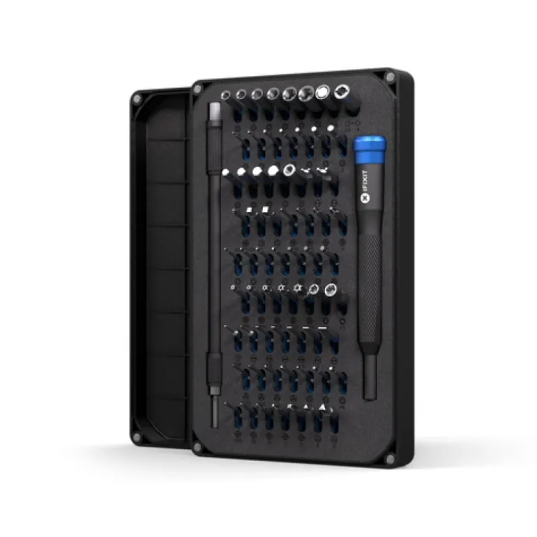 iFixit EU145299. Número de bits: 64 pieza(s), Desatornillador/puntas incluidas: Plano, Hex (metric), JIS B 1012, Llave de vaso, Pentalobe, Phillips, Robertson, Security Torx,…, Brocas para destornillador Philips: PH 0,PH 00,PH 000,PH 1,PH 2. Forma del vástago: Hexagonal, Material de la caja: ABS