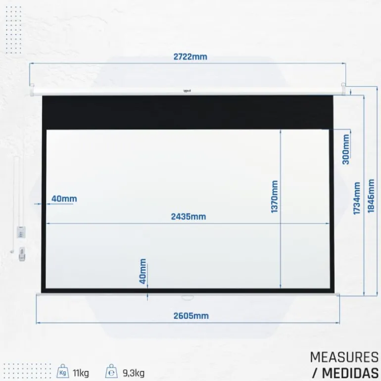 Formato 16:9 (110″): área visible 243×137 cm con bordes negros de 4 cm para mejor enmarcado.