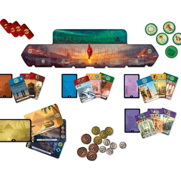 - 1 tablero, 23 cartas Era I, 23 cartas Era II, 20 cartas Era III, 7 cartas de Gremio, 12 cartas de Maravilla, 4 fichas Militares, 10 fichas de Progreso, 1 medidor de Conflicto, 31 monedas (14 de valor 1, 10 de valor 3 y 7 de valor 6), 1 cuadernillo de puntuación, 1 hoja resumen y 1 reglamento.