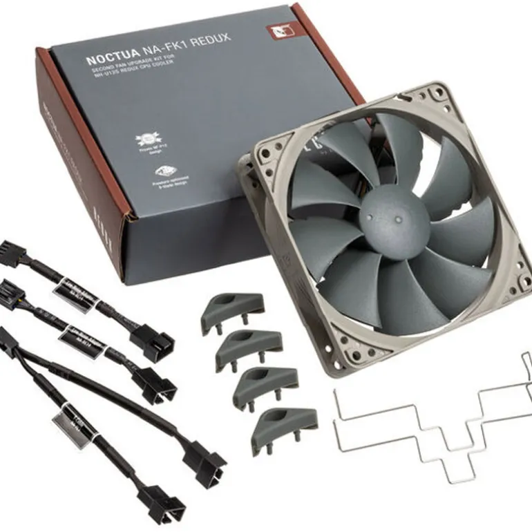 El NA-FK1 es un segundo kit de ventilador para el enfriador de CPU NH-U12S redux. Actualizarlo a una configuración de doble ventilador de estilo empujar / tirar permite mejorar aún más el rendimiento de enfriamiento o reducir los niveles de ruido al tener dos ventiladores funcionando a velocidades más bajas. El kit incluye un segundo ventilador NF-P12 redux-1700 PWM, almohadillas antivibración, clips de montaje del ventilador, un cable Y PWM de 4 pines, así como dos adaptadores de bajo ruido: ¡todo lo que necesitas para aumentar la eficiencia de tu NH-U12S redux!