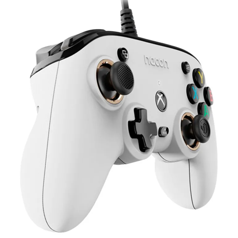 El Mando Nacon Pro Compact Blanco es oficialmente diseñado para Xbox, pero también es compatible con Xbox One y PC, lo que lo convierte en un mando versátil para jugadores que disfrutan de varios dispositivos. Además, el conector para auriculares de 3,5 mm te permite conectar tus auriculares y disfrutar de sonido de alta calidad mientras juegas.