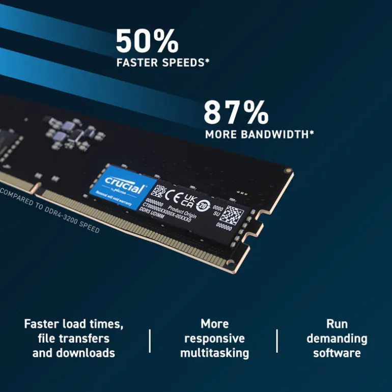 La memoria DDR5 de escritorio de Crucial puede permitir que su computadora transfiera un 50 % más de datos que DDR4 en el lanzamiento, lo que resulta en tiempos de carga, transferencias de archivos, descargas, frecuencias de actualización más rápidas y menos tiempo de retraso. Debido a la mayor eficiencia del bus, la tecnología DDR5 no solo es más rápida que la generación anterior, sino que es mejor