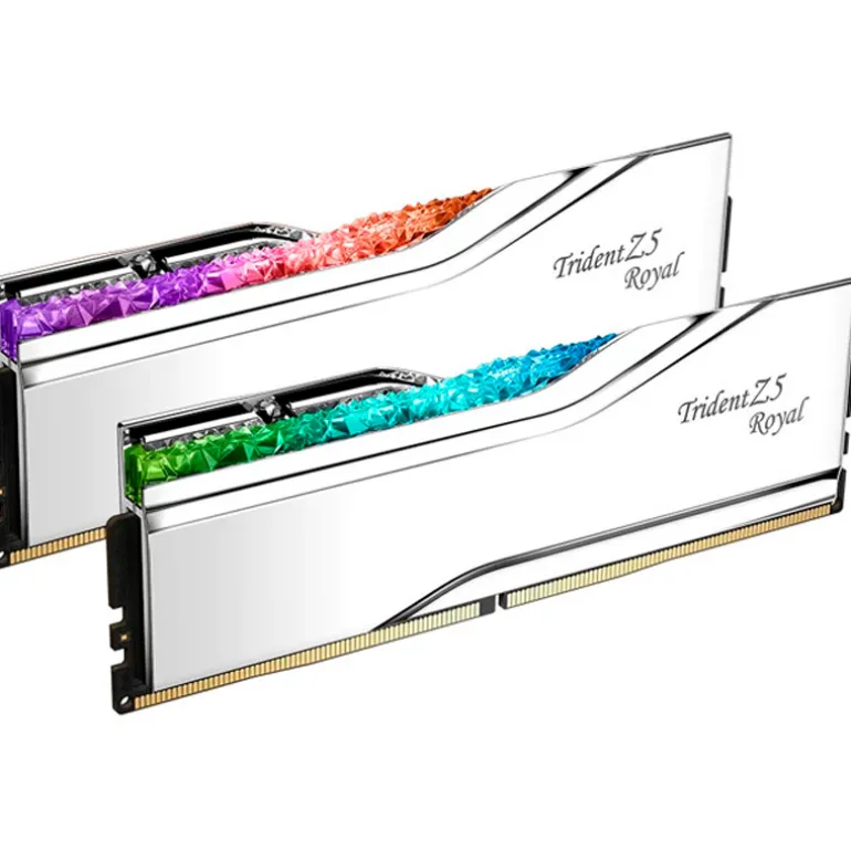 La Trident Z5 Royal es la clase de lujo de memoria DDR5 de alto rendimiento diseñada para plataformas Intel, con un diseño de joya de la corona con una barra de luz cristalina para una magnífica pantalla de iluminación RGB personalizable y disipadores de calor de aluminio electrochapado con acabado espejado en colores dorados o plateados.