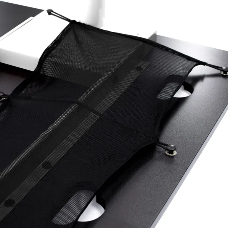El Fratello tiene 3 cortes en la parte superior de la superficie que conducen a una cesta de malla que se sujeta firmemente contra la parte inferior del tablero para la gestión de cables.