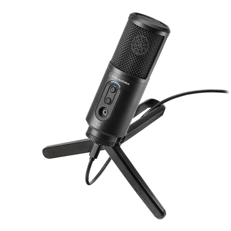 El micrófono también tiene un conector para auriculares con botones de control de volumen para subir/bajar el volumen para un control directo del audio. El ATR2500x-USB viene con dos cables de 2 m (USB-C a USB-C, USB-C a USB-A), un soporte para pedestal con rosca pivotante que se acopla perfectamente al trípode incluido o a un pedestal para micrófono convencional.