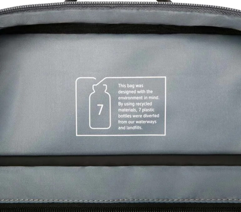 Esta bolsa se ha diseñado pensando en el medio ambiente. Mediante el uso de materiales reciclados con certificación GRS, se evitó que 7 botellas de plástico llegaran a nuestras vías fluviales y vertederos, se trituraron en pequeños copos, se repolimerizaron en bolitas de plástico, y se calentaron e hilaron para convertirlas en hilo que se cosió y formó el tejido de esta bolsa EcoSmart®.