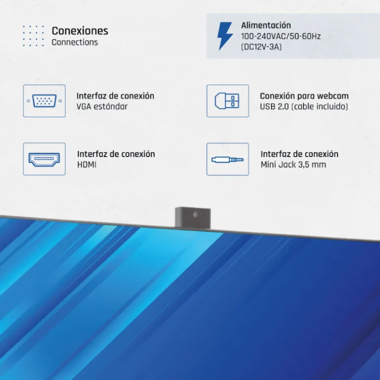 Este monitor está diseñado para ofrecer la máxima privacidad en oficinas y despachos gracias a su webcam integrada retráctil. La cámara web se puede subir y bajar cuando quieras, es de 3 MP y funciona a 30 fps, además, permite elegir el formato y resolución que más se ajuste a las necesidades de tus reuniones: 4:3 con resolución 2048×1536 px o 16:9 con resolución 2304×1296 px. También cuenta con micrófono integrado para que no te falte de nada en tus videollamadas. Como conexiones, presenta un puerto HDMI 1.4, un VGA y un mini jack 3,5 mm. Es un monitor frameless, es decir, sin marco. Y su panel se puede inclinar de los -5º a los 20º.