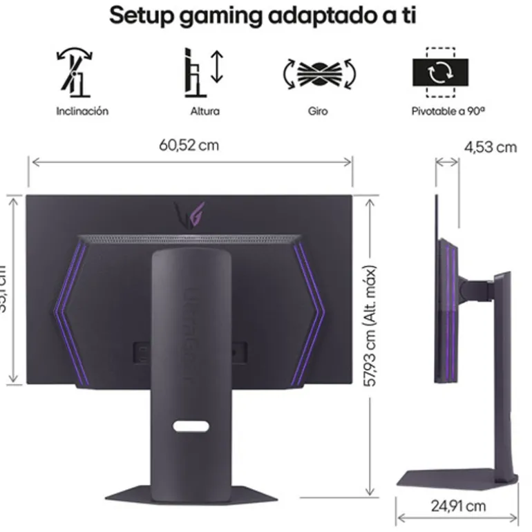 Logra el setup perfecto con su iluminación hexagonal y un diseño minimalista de bordes ultrafinos en los cuatro lados. Su base completamente ajustable ofrece rotación, inclinación, ajuste de altura y pivote para adaptarse a tus necesidades. Además, el soporte en forma de L, compacto y con un amplio rango de rotación, está diseñado para maximizar el espacio en tu escritorio, eliminando eficazmente los puntos muertos de tu setup.