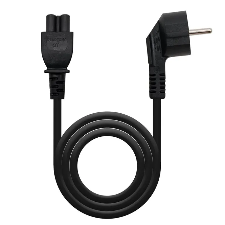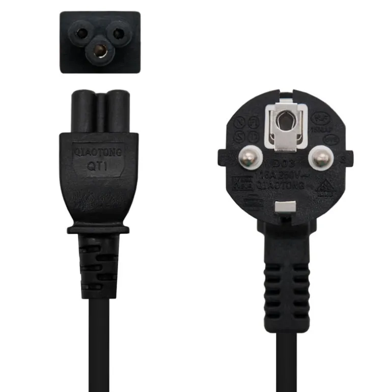 Cable alimentación trébol para cargador portatiles. Fabricado con conductor 100% cobre de AWG18 para dispositivo con consumo inferior a 1500W. Conector CEE7 macho en un extremo y C5 hembra en el otro.