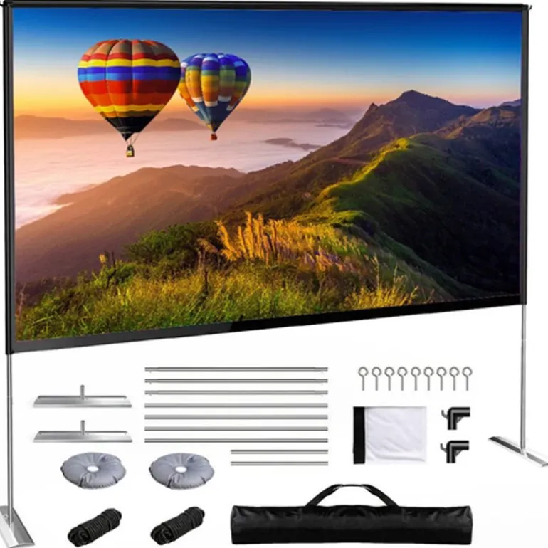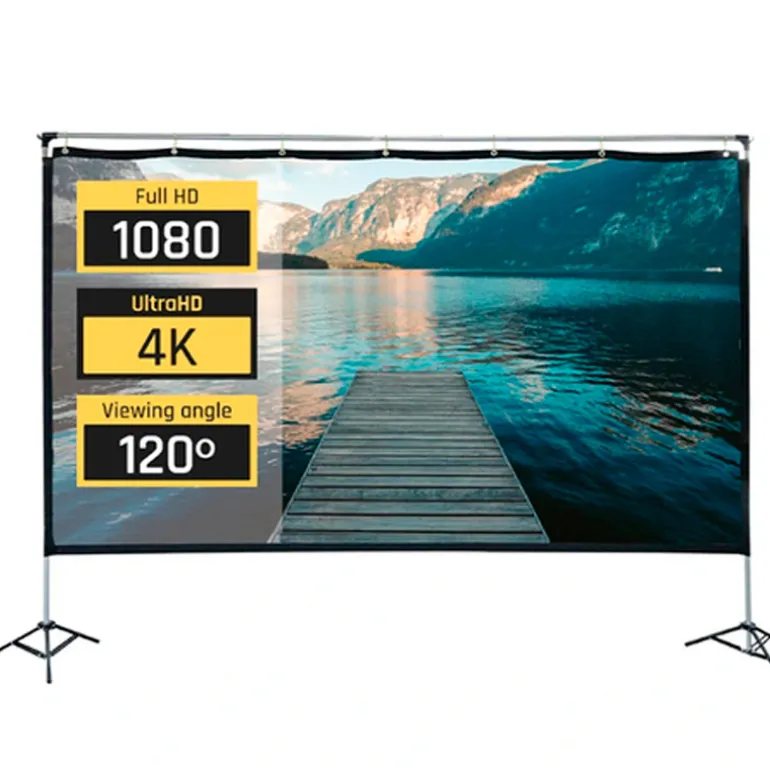 La pantalla de proyección exterior portable iggual de 100″ (221 x 124 cm) está diseñada para disfrutar de cine, series y contenidos multimedia al aire libre o en interior con gran comodidad. Su estructura desmontable de aluminio es ligera, resistente e inoxidable, e incluye bolsa de transporte y accesorios para una instalación segura. La tela elástica de poliéster ofrece una superficie de proyección nítida, lavable y antiarrugas, compatible con proyectores HD, Full HD y 4K.