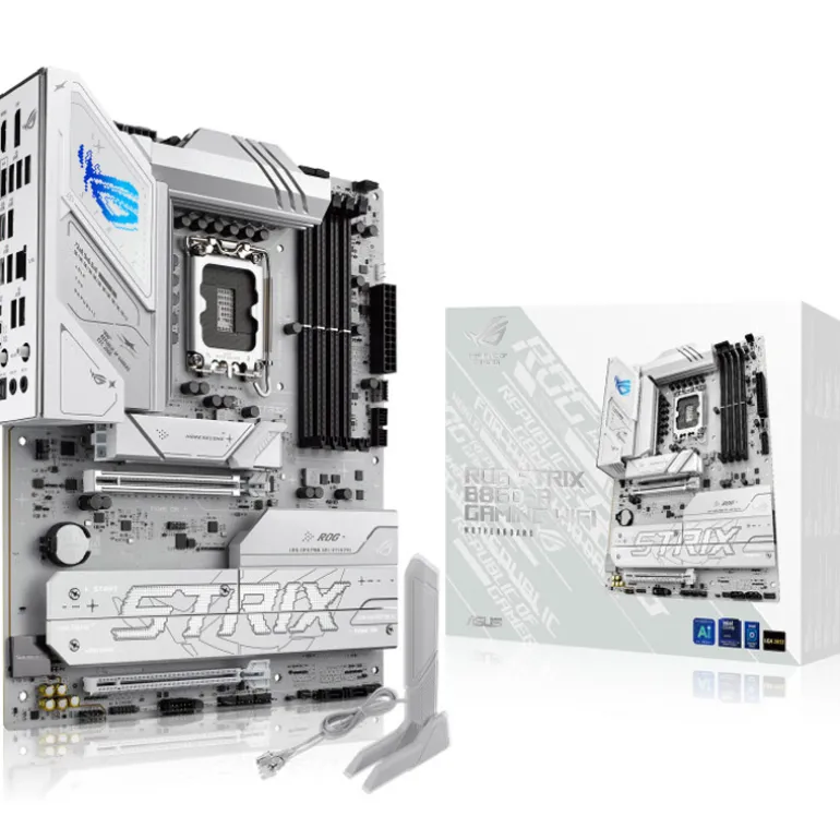 La ROG Strix B860-A presenta un diseño blanco limpio que complementa cualquier construcción. Sus disipadores de calor metálicos a juego realzan el aspecto elegante, mientras que la iluminación Aura Sync RGB agrega efectos personalizables para un estilo sutil o audaz.
