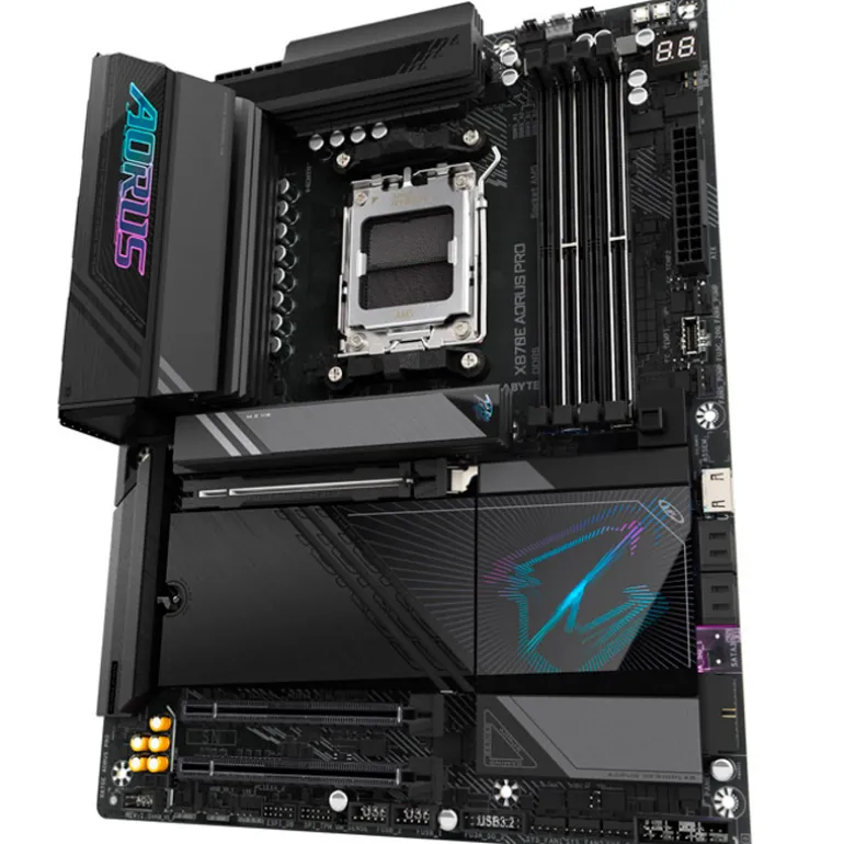 La Gigabyte X870E AORUS Pro es una placa base de alto rendimiento para procesadores AMD Ryzen鈩ápido con 4 ranuras M.2 (3 PCIe 5.0 x4), conectividad avanzada con Wi-Fi 7, LAN 2.5 GbE y Dual USB4 Tipo-C, además de un diseño térmico optimizado con armadura VRM y disipadores M.2 sin tornillos.