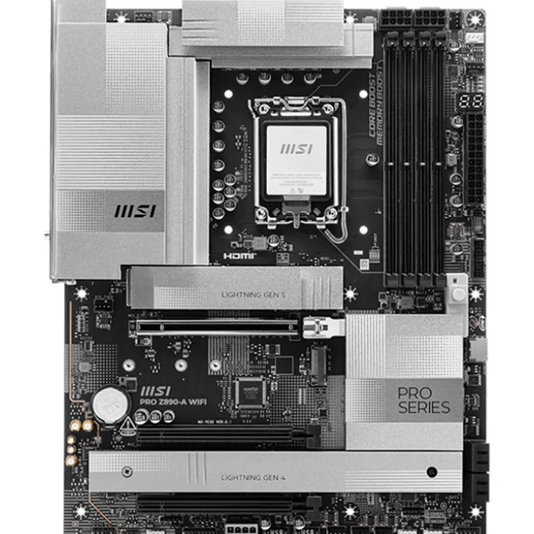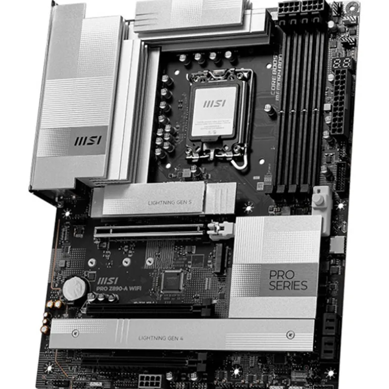 La PRO Z890-A WIFI presenta un diseño sencillo con una armoniosa combinación de color plateado que encaja perfectamente tanto en configuraciones de PC blancas como negras. Está diseñada con múltiples características exclusivas de MSI, incluyendo Wi-Fi 7 real con EZ Antenna, LAN 5G, Thunderbolt 4, PCIe 5.0 M.2 con EZ M.2 Shield Frozr II y alimentación PCIe suplementaria, preparada para los procesadores Intel® Core鈩
