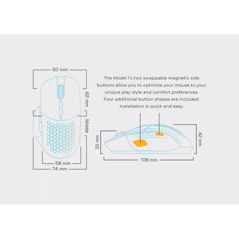 Nuestro mouse liviano con más funciones hasta el momento. 9 botones programables con 2 botones de pulgar magnéticos personalizables que te dan el control. Mirando la forma ergonómica altamente cómoda, es difícil creer que el Modelo I pesa solo 69 g.