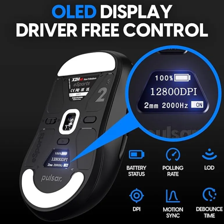 - PANTALLA OLED, CONTROL SIN CONDUCTOR: supervise fácilmente los niveles de batería y ajuste las configuraciones clave, como LOD, tiempo de rebote, sincronización de movimiento, tasa de sondeo y DPI, utilizando botones de mouse dedicados, todo sin la necesidad de controladores externos.