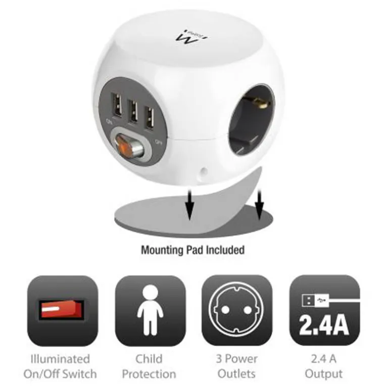 Con la unidad de alimentación Power Block EW3939 podrá conectar 3 dispositivos eléctricos y 3 dispositivos USB al mismo tiempo. Los puertos USB tienen una capacidad total de 2, 4A y incluyen protección contra subidas de tensión y cortocircuitos. Las tres salidas de alimentación están equipadas con protección para niños. Puede instalar la unidad Power Block en su escritorio. Utilice la almohadilla de montaje incluida para asegurarse de que el Power Block permanezca sujeto en su lugar. Active o desactive las 3 salidas de alimentación y puertos USB al mismo tiempo con el interruptor de encendido/apagado con iluminación.