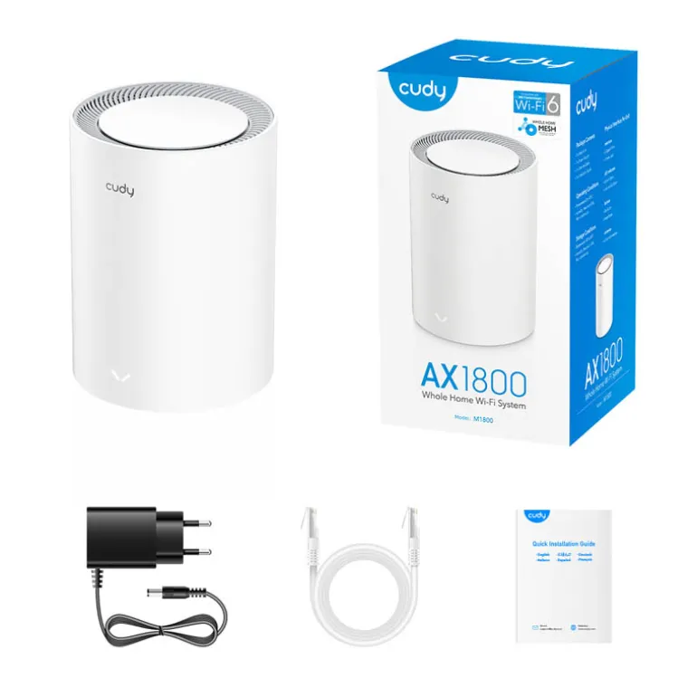 - Contenido del Paquete: Router AX1800 Wi-Fi 6 Mesh (1 unidad) Adaptador de Corriente Cable Ethernet RJ45 Guía de Instalación Rápida